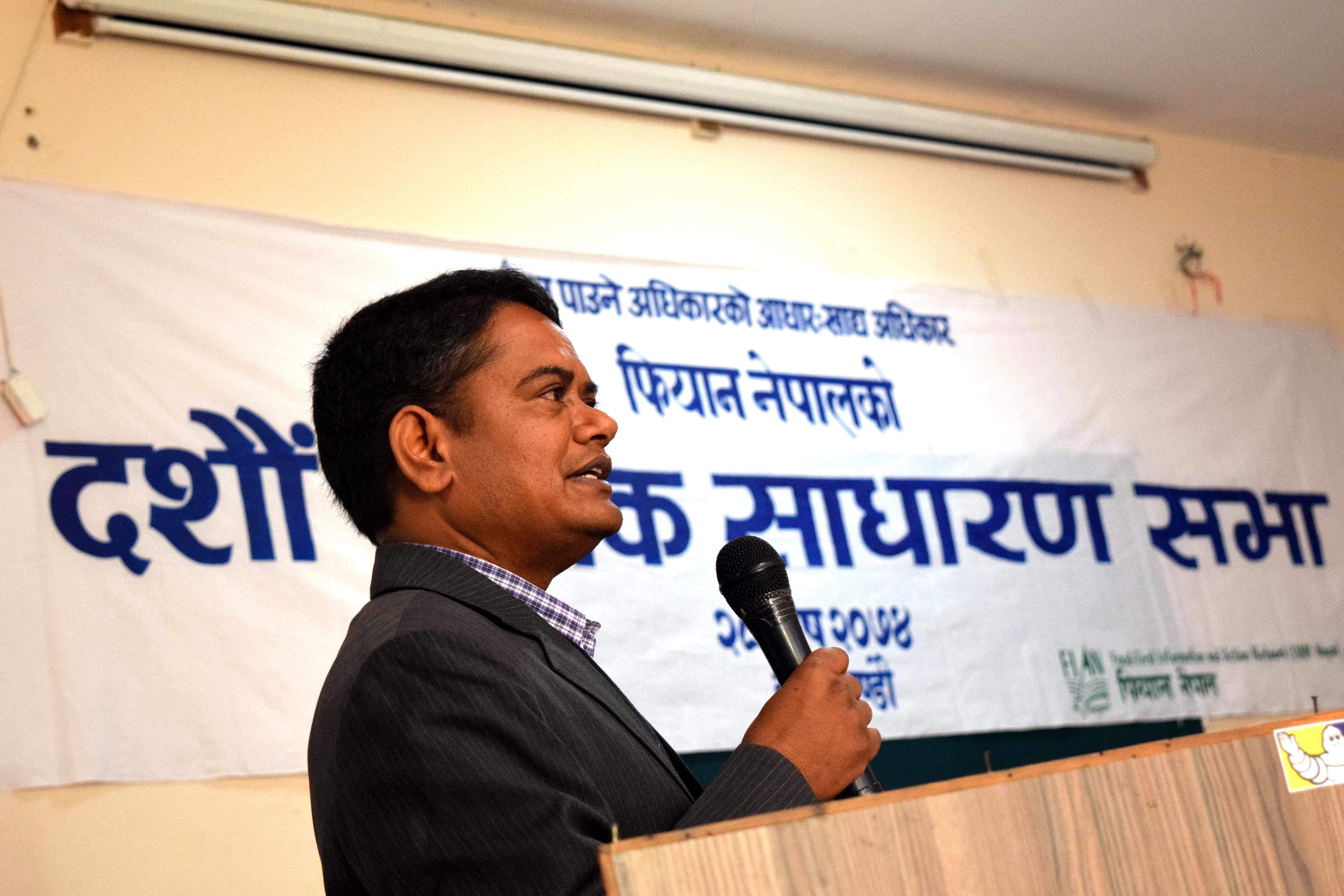 अझै पनि नेपालमा भोकमरी, गरिवी, विपन्नता, कुपोषण, व्याप्त छ । अधिकांश समुदायहरु अझैपनि खाद्य अधिकारवाट बञ्चित भई जोखिमपूर्ण जीवन बाँच्न बाध्य छन् । फियान नेपालले जोखिममा रहेका समुदायको खाद्य अधिकार सुनिश्चतताका लागि स्थापना कालदेखि विभिन्न गतिविधि गर्दै आएको छ । भोकमुक्त नेपालको परिकल्पना गरी खाद्य अधिकारको दृष्टिले जोखिममा रहेका क्षेत्र तथा समुदायहरु पहिचान गरी सवाल सम्बोधनका लागि विभिन्न संघसंस्था, व्यक्ति तथा नागरिक अभियन्ताहरुको साथ सहयोग र सहकार्यमा प्रभावकारी भूमिका निर्वाह गर्दै आएको व्यहोरा अवगत गराउन चाहन्छु । विषेश गरी गरिवी, भोकमरी र कुपोषणले प्रताडित नेपालको सुदुरपश्चिम, मध्यपश्चिम र नेपाल–भारतको सीमा क्षेत्रका समुदायको सवाल सम्बोधनकालागि संस्था कृयाशिल छ । साथै खाद्य अधिकारसंग सम्बन्धित नीतिगत पैरवीकालागि सरकारी तथा गैर–सरकारी निकायहरुसंगको सहकार्यमा प्रभावकारी गतिविधि गर्दै आएको छ ।
