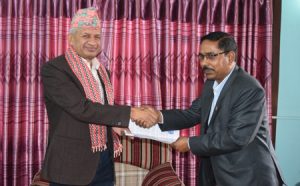 Honorable Member of Parliament Mr. Ram Lakhan Harijan handing over the memorandum to the Honorable Minister of Foreign Affairs Mr. Pradeep Kumar Gyawali