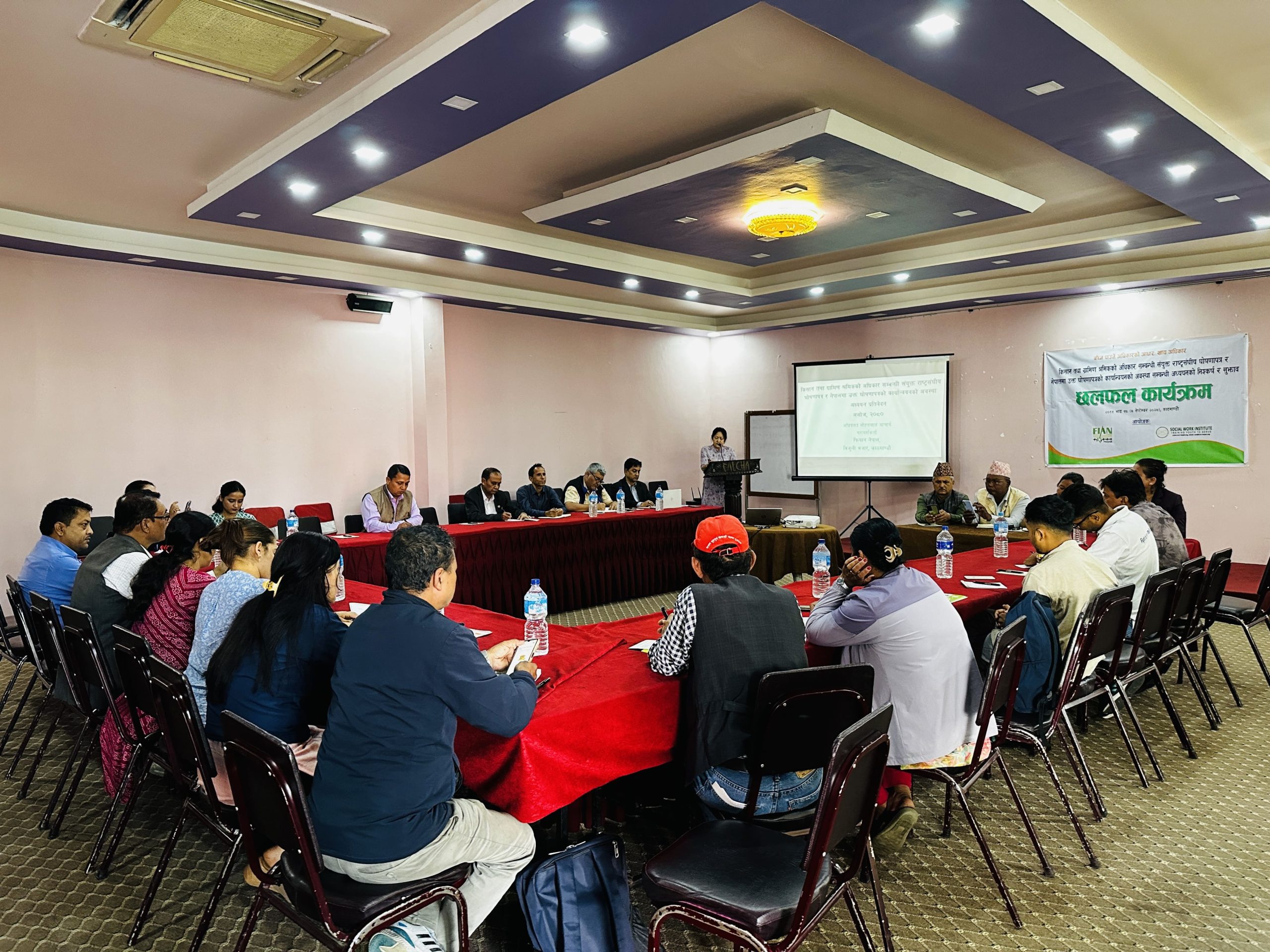 फियान नेपाल (FIAN Nepal)तथा सामाजिक सेवा अध्ययन केन्द्र (Social Work Institute – SWI) ले संयुक्त रुपमा सम्पन्न गरेको किसान तथा ग्रामिण श्रमिकको अधिकार सम्बन्धी संयुक्त राष्ट्रसंघीय घोषणापत्र (United Nations Declaration on the Rights of Peasants and Other People Working in Rural Areas) र नेपालमा उक्त घोषणापत्र कार्यान्वयनको अवस्था सम्बन्धी अध्ययनको निश्कर्ष सम्बन्धित सरोकारवालाहरुमा जानकारी गराउने उद्देश्यका साथ छलफल कार्यक्रम आयोजना गरेको छ । उक्त कार्यक्रममा संघको कृषि तथा प्राकृतिक श्रोत समितिका माननीय सदस्य, राष्ट्रिय किसान आयोगका माननीय सदस्य, राष्ट्रिय मानव अधिकार आयोगका प्रतिनिधि, किसान संघ संसथाका प्रतिनिधी तथा विभिन्न गैर सरकारी निकायका प्रमुख तथा प्रतिनिधीहरुको उपस्थिती रहेको थियो । फियान नेपालको अध्यक्ष गोकर्ण रुपाखेतीले अध्यक्षता गनुभएको उक्त कार्यक्रममा अधिवक्ता मोहन आचार्यले अध्ययनको निश्कर्ष शेयर गर्नुभएको थियो